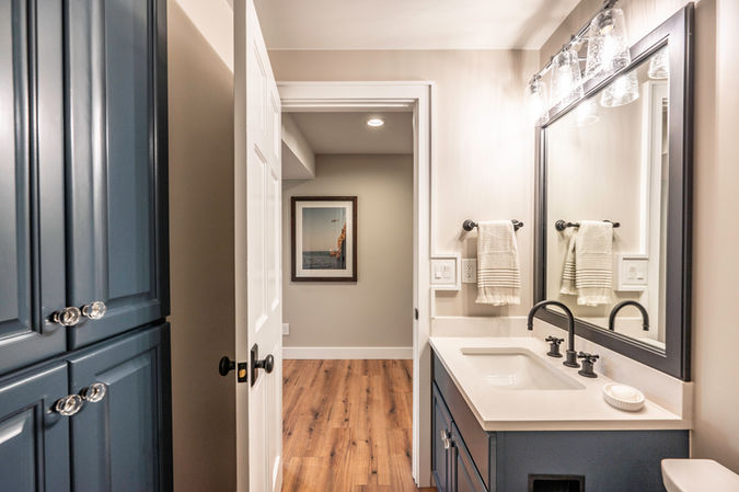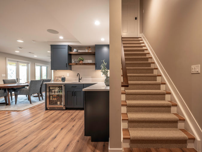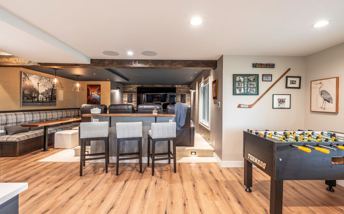 Talk about family fun! This area has been transformed into an entertaining haven for families, serving a multitude of purposes. A unique custom banquette offers plenty of seating for movie nights and game days, making the TV/home theater space exceptional. A small bar area has been converted into a more practical and family-friendly kitchenette. Fun is the main focus, with numerous play areas including pool, poker, and air hockey. The layout was crucial to maximize the use of space for any entertainment needs. The warm flooring and custom wool carpeting add a soft touch, balancing the various wood tones and custom-colored cabinetry. Custom furnishings complete the decor, bringing in bursts of color.